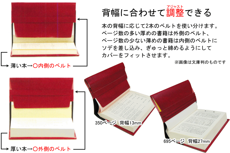 特徴・仕様 薄い本から、厚い本まで 2本のベルトを使い分けることで、より厚い本にも対応するブックカバーです。